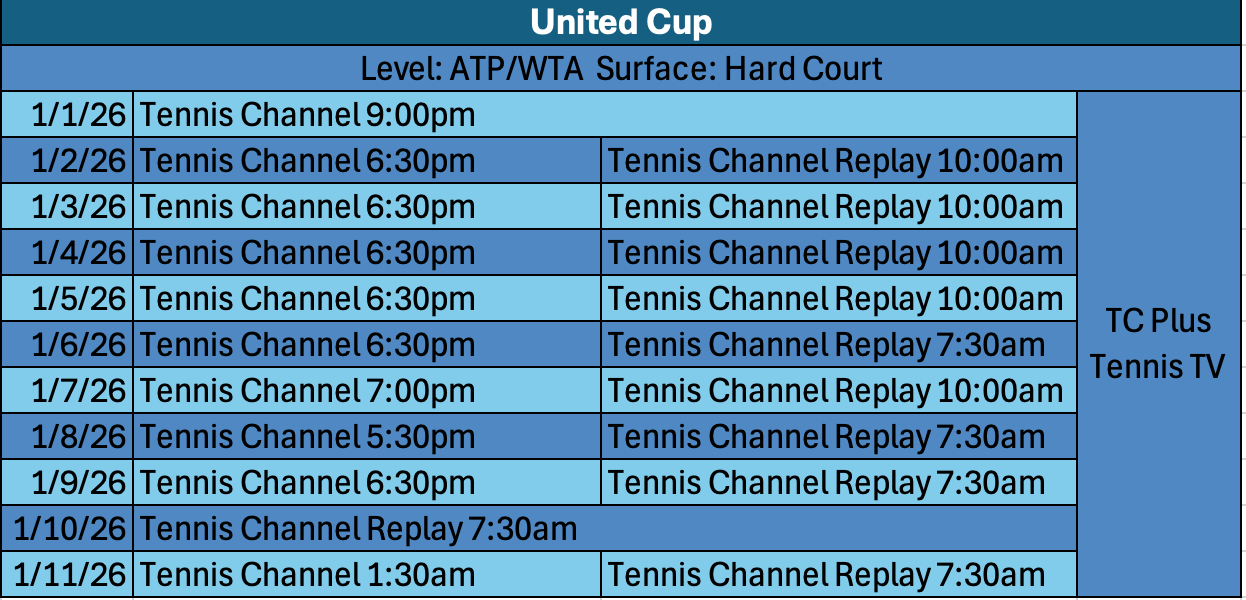 Welcome to 2026, Tennis Watchers! We are back full force with the first guide of the year as live tennis will kick off News Years Day. Escape the cold and snow to the sunny Australian Swing with United Cup action kicking off the new year. If you are a subscriber over the past month, welcome! You’ll get a weekly rundown of tournaments, how to watch them, and key links (Socials/Weather/Time Conversions) for each tournament.