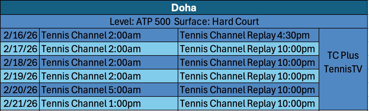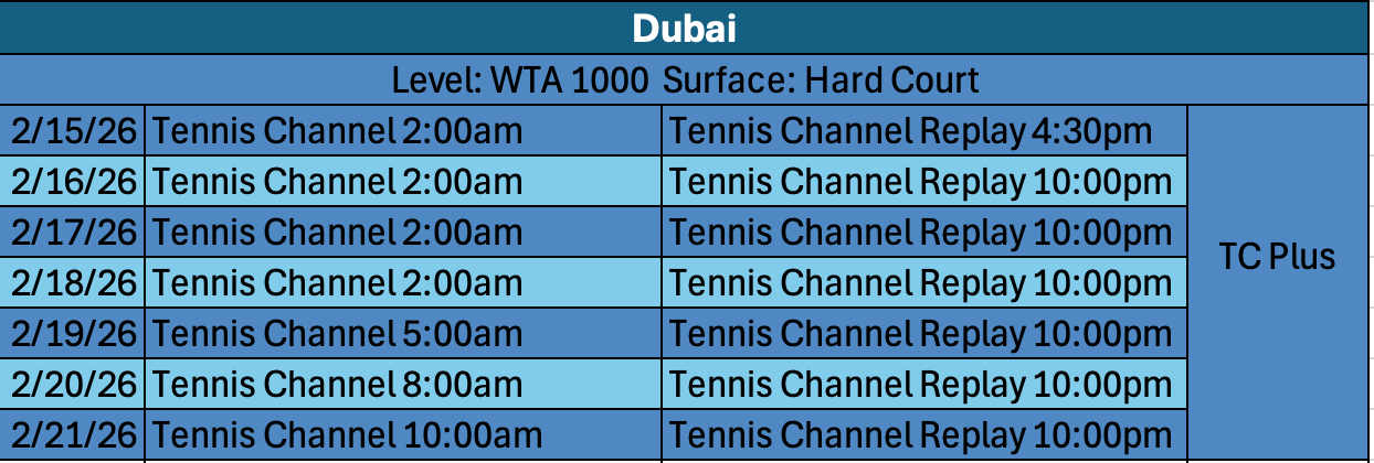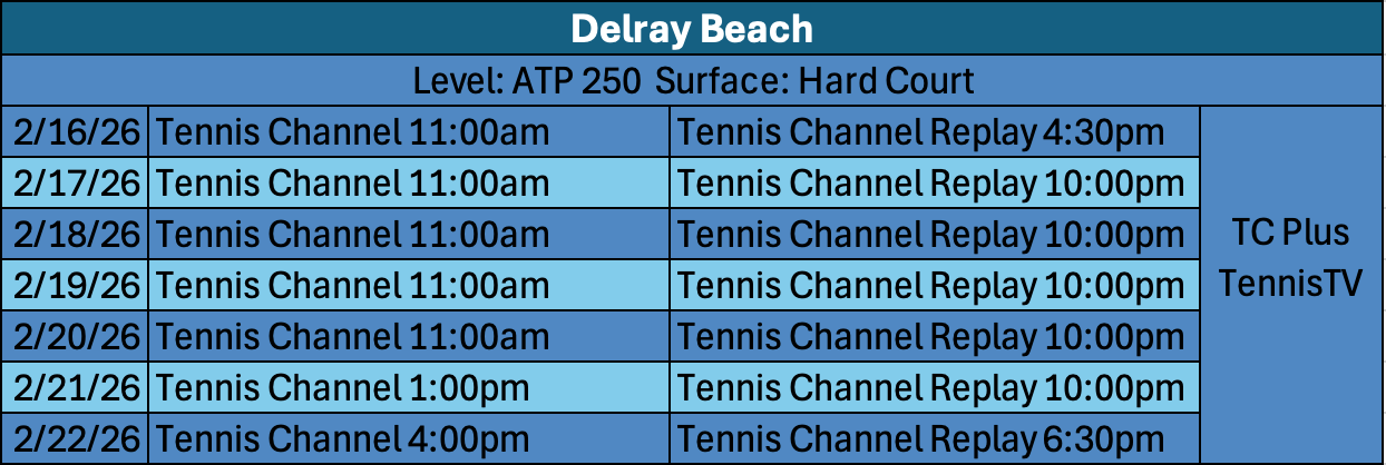 Coverage continues Tennis Channel (TC Plus/Tennis TV streaming) for the week. We’ve got another week of all day live tennis as well. Dubai/Doha will be live early morning hours here with Delray Beach and Rio de Janeiro kicking off late morning and running into the nighttime. Check out the full guide below and enjoy the tennis!